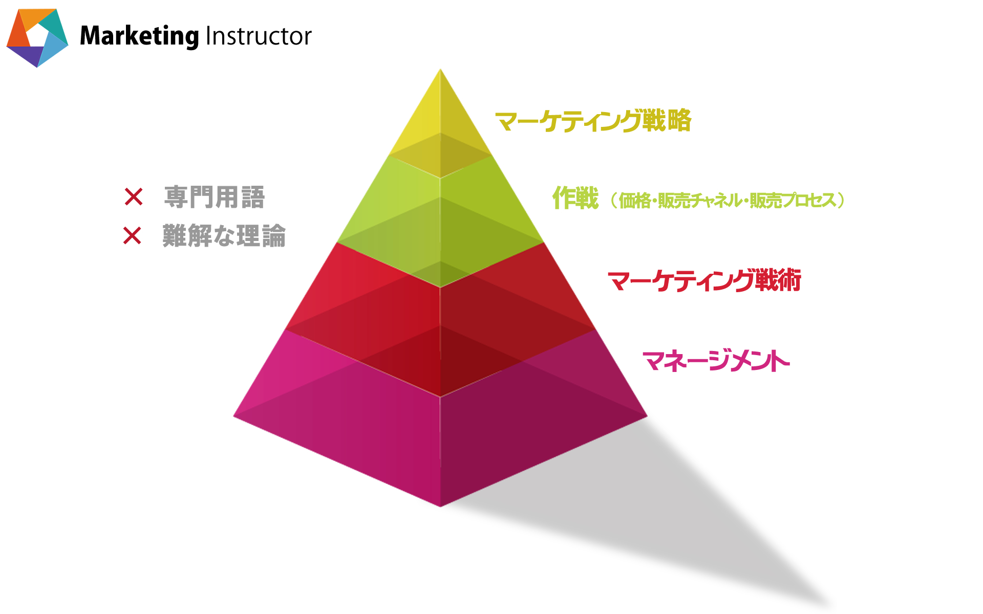私たちの講座では「コトラーによると~」であるとか、「STPとは~」というお話はしません。学べるのはマーケティングで成果を上げるためのノウハウです。私たちは「このような場合に成果を出すためのポイントは~」とお話をします。動画教材ではできるだ単刀直入にお話をします。