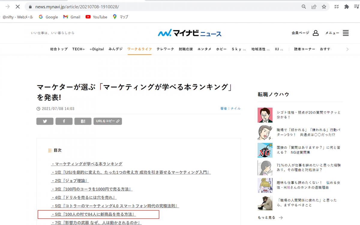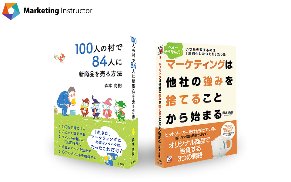 本ビジネススクールは、マイナビニュース「マーケター179人が選んだマーケティングが学べて、おすすめしたいマーケティング本ランキング」で、ベスト5に選ばれた「100人の村で84人に新商品を売る方法」の著者 森本尚樹が全プログラムを開発し専任講師を務めています。