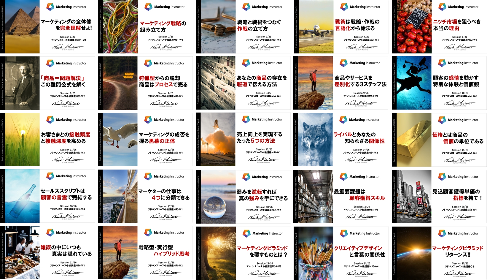 実践マーケティングオンラインスクールで学べるのは、失敗に失敗を重ね、試行錯誤を続けながら体系化した生きたマーケティングです。「マーケティングは他社の強みを捨てることから始まる」(明日香出版社)「100人の村で84人に新商品を売る方法」(雷鳥社)は多くの読者から高く評価されましたが、本にも書けなかったマーケティングの実戦現場のリアルがここで学べます。